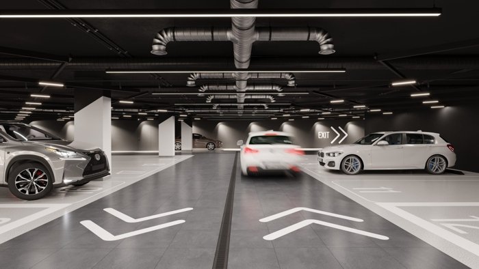 Под жилыми корпусами расположен двухуровневый подземный паркинг с высокоскоростным интернетом и зарядками для электромобилей и электросамокатов.