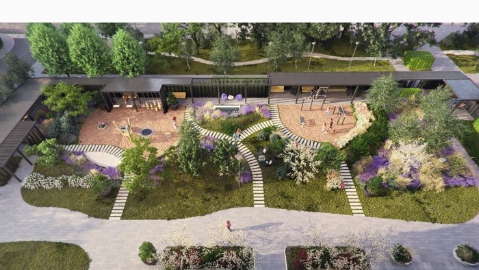 В него входят приватные зелёные дворы, прогулочный бульвар, сенсорный сад, многофункциональные игровые и спортивные площадки.